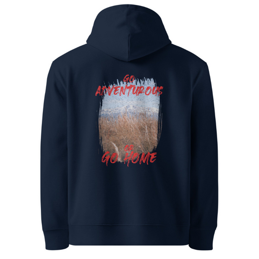 ‘Go Adventurous or Go Home’ Unisex Organic Cotton Hoodie – Mountain Grassland Design
